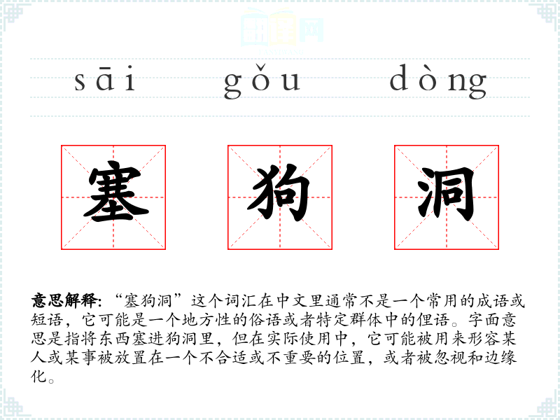 由于“塞狗洞”不是一个标准的中文词汇,它的词源和演变可能不明确。它可能是由地方方言或特定社群中的俚语演变而来,随着时间的推移,其含义可能会有所变化。