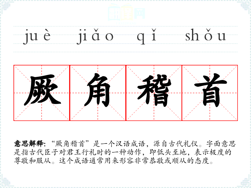 “厥角稽首”是一个汉语成语,源自古代礼仪。字面意思是指古代臣子对君王行礼时的一种动作,即低头至地,表示极度的尊敬和服从。这个成语通常用来形容非常恭敬或顺从的态度。