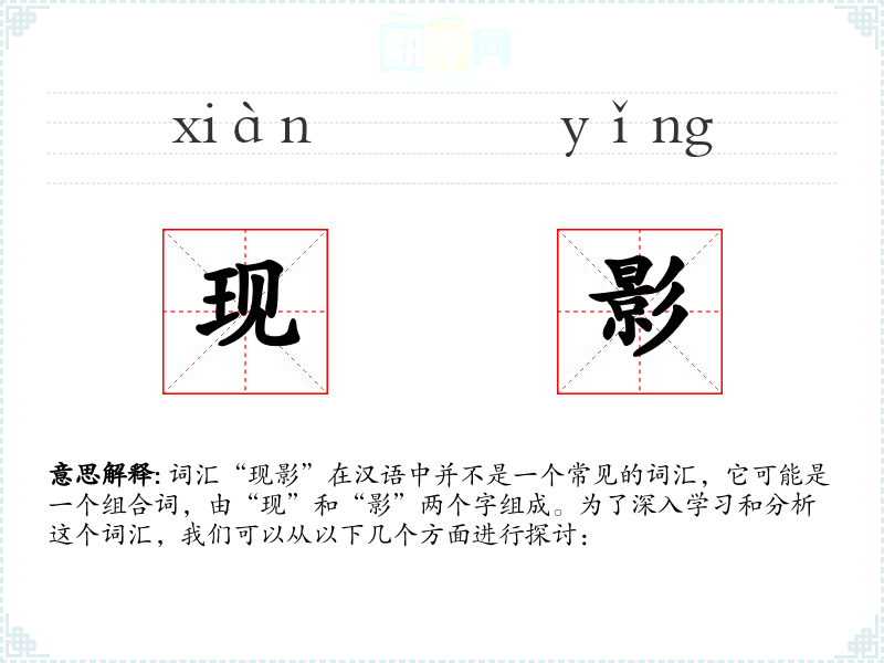 词汇“现影”在汉语中并不是一个常见的词汇,它可能是一个组合词,由“现”和“影”两个字组成。为了深入学习和分析这个词汇,我们可以从以下几个方面进行探讨: