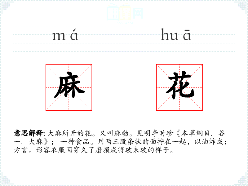 大麻所开的花。又叫麻勃。见明李时珍《本草纲目.谷一.大麻》; 一种食品。用两三股条状的面拧在一起,以油炸成; 方言。形容衣服因穿久了磨损成将破未破的样子。