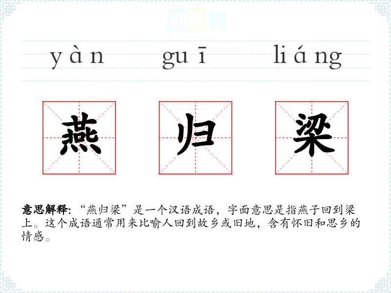 “燕归梁”是一个汉语成语,字面意思是指燕子回到梁上。这个成语通常用来比喻人回到故乡或旧地,含有怀旧和思乡的情感。