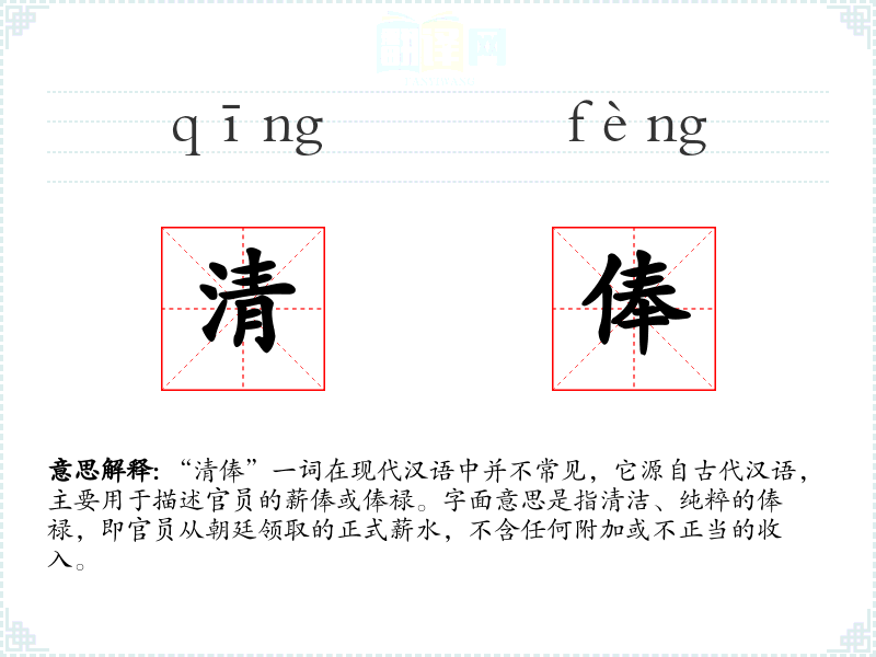 “清俸”一词在现代汉语中并不常见,它源自古代汉语,主要用于描述官员的薪俸或俸禄。字面意思是指清洁、纯粹的俸禄,即官员从朝廷领取的正式薪水,不含任何附加或不正当的收入。