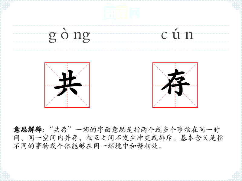 “共存”一词的字面意思是指两个或多个事物在同一时间、同一空间内并存,相互之间不发生冲突或排斥。基本含义是指不同的事物或个体能够在同一环境中和谐相处。