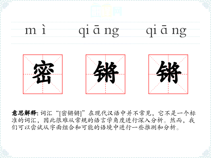 “密锵锵”由三个字组成:“密”通常指紧密、密集或秘密;“锵”是一个拟声词,模仿金属撞击的声音,如“锵锵”形容金属碰撞的声音;“锵”在这里可能重复以加强语气或效果。