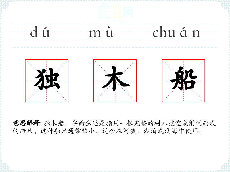 独木船:字面意思是指用一根完整的树木挖空或削制而成的船只。这种船只通常较小,适合在河流、湖泊或浅海中使用。