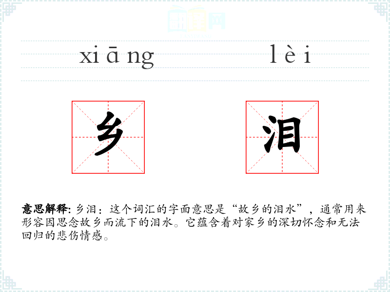 乡泪:这个词汇的字面意思是“故乡的泪水”,通常用来形容因思念故乡而流下的泪水。它蕴含着对家乡的深切怀念和无法回归的悲伤情感。