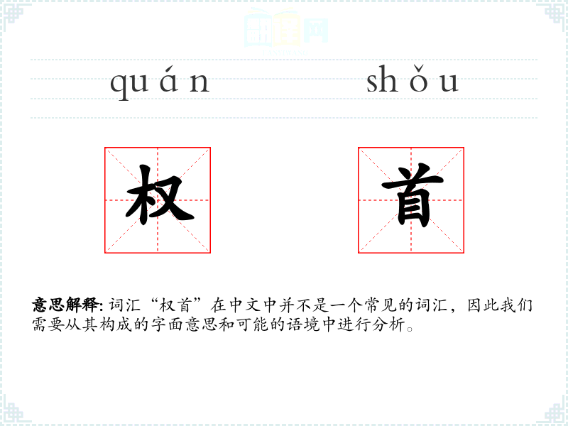 词汇“权首”在中文中并不是一个常见的词汇,因此我们需要从其构成的字面意思和可能的语境中进行分析。