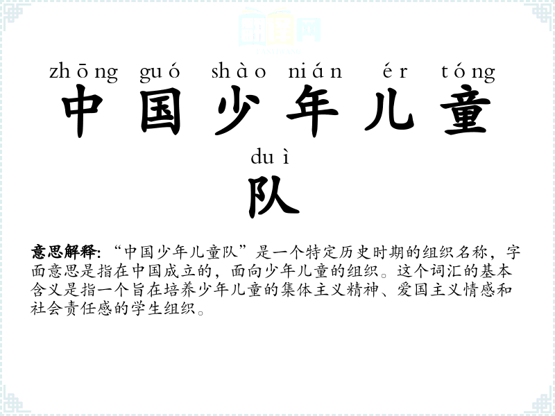 “少年儿童队”是一个特定历史时期的组织名称,字面意思是指在成立的,面向少年儿童的组织。这个词汇的基本含义是指一个旨在培养少年儿童的集体主义精神、爱国主义情感和社会责任感的学生组织。