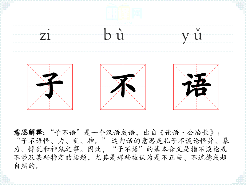 “子不语”是一个汉语成语,出自《论语·公冶长》:“子不语怪、力、乱、神。” 这句话的意思是孔子不谈论怪异、暴力、悖乱和神鬼之事。因此,“子不语”的基本含义是指不谈论或不涉及某些特定的话题,尤其是那些被认为是不正当、不道德或超自然的。