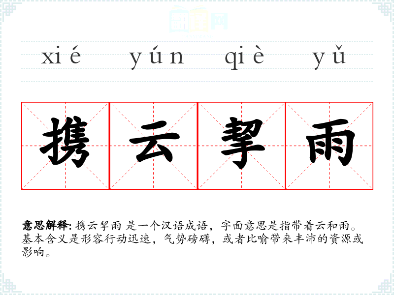 携云挈雨 是一个汉语成语,字面意思是指带着云和雨。基本含义是形容行动迅速,气势磅礴,或者比喻带来丰沛的资源或影响。