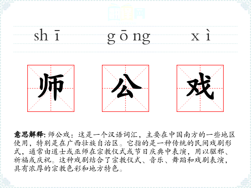 师公戏:这是一个汉语词汇,主要在南方的一些地区使用,特别是在广西壮族自治区。它指的是一种传统的民间戏剧形式,通常由道士或巫师在仪式或节日庆典中表演,用以驱邪、祈福或庆祝。这种戏剧结合了仪式、音乐、舞蹈和戏剧表演,具有浓厚的色彩和地方特色。