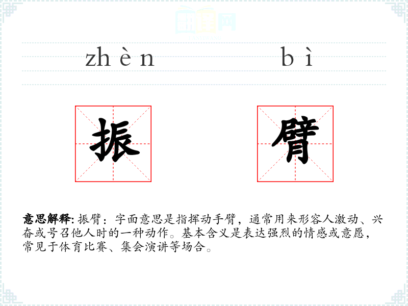 振臂:字面意思是指挥动手臂,通常用来形容人激动、兴奋或号召他人时的一种动作。基本含义是表达强烈的情感或意愿,常见于体育比赛、**演讲等场合。