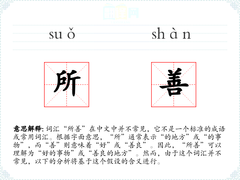 词汇“所善”在中文中并不常见,它不是一个标准的成语或常用词汇。根据字面意思,“所”通常表示“的地方”或“的事物”,而“善”则意味着“好”或“善良”。因此,“所善”可以理解为“好的事物”或“善良的地方”。然而,由于这个词汇并不常见,以下的分析将基于这个假设的含义进行。