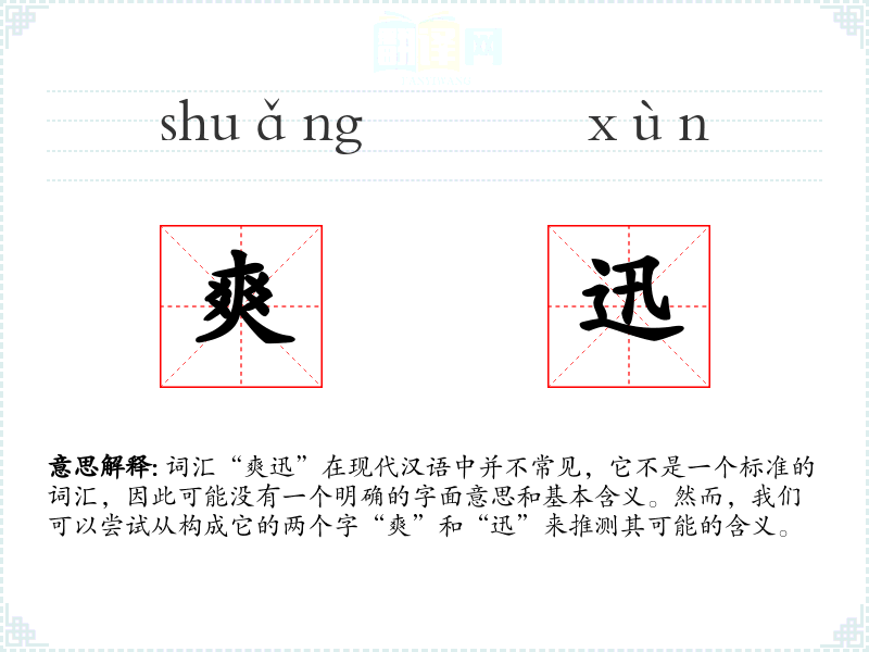 词汇“爽迅”在现代汉语中并不常见,它不是一个标准的词汇,因此可能没有一个明确的字面意思和基本含义。然而,我们可以尝试从构成它的两个字“爽”和“迅”来推测其可能的含义。
