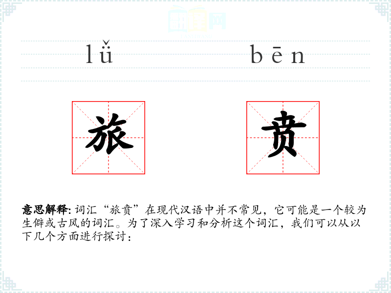 词汇“旅贲”在现代汉语中并不常见,它可能是一个较为生僻或古风的词汇。为了深入学习和分析这个词汇,我们可以从以下几个方面进行探讨: