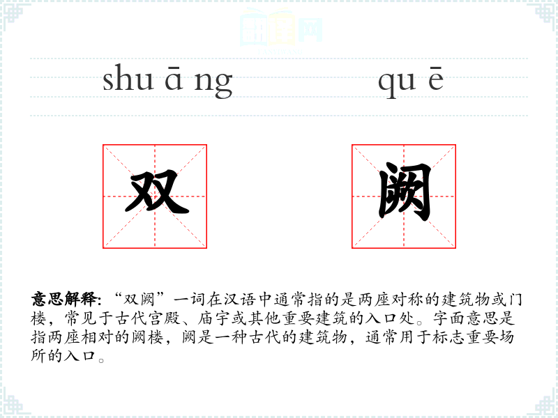 “双阙”一词在汉语中通常指的是两座对称的建筑物或门楼,常见于古代宫殿、庙宇或其他重要建筑的入口处。字面意思是指两座相对的阙楼,阙是一种古代的建筑物,通常用于标志重要场所的入口。