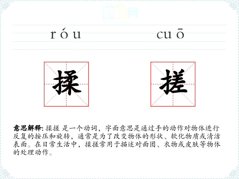 揉搓 是一个动词,字面意思是通过手的动作对物体进行反复的按压和旋转,通常是为了改变物体的形状、软化物质或清洁表面。在日常生活中,揉搓常用于描述对面团、衣物或皮肤等物体的处理动作。