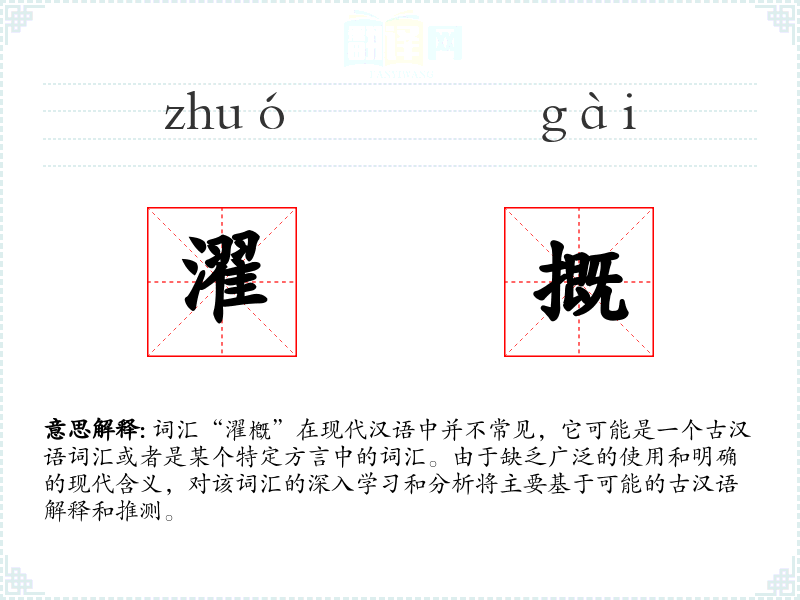 由于“濯槪”不是一个现代常用词汇,它在文学、口语或专业领域中的使用非常有限。在古文献中可能会有所提及,但需要具体文献来考证其确切含义和用法。