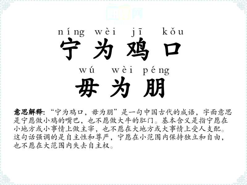 这句成语出自《战国策·韩策一》,原文是“宁为鸡口,无为牛后”,后来演变为“宁为鸡口,毋为朋”。在古代,这句成语用来形容人的志向和选择,强调个人的独立和尊严。