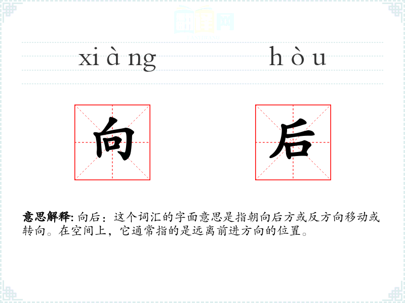 “向后”由“向”和“后”两个字组成。“向”字古汉语中意为朝向,“后”字意为后方。这两个字组合起来,形成了表示朝向后方的意思。