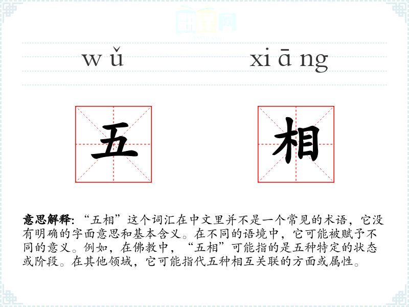 “五相”的词源并不明确,它可能是由“五”和“相”两个字组合而成,其中“五”表示数量,“相”表示状态或属性。在历史演变中,这个词汇可能随着不同的文化和学科的发展而被赋予不同的含义。