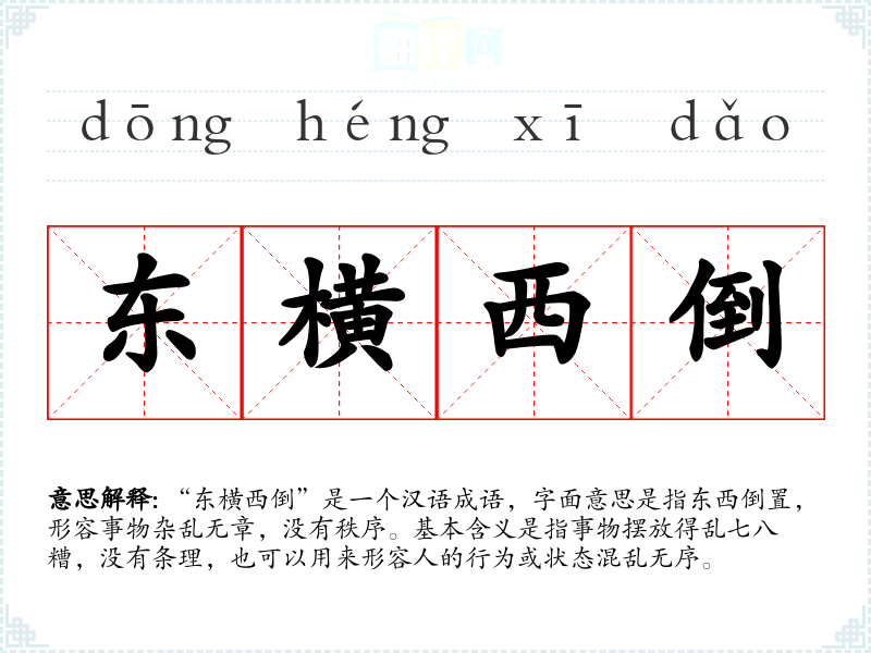 “东横西倒”是一个汉语成语,字面意思是指东西倒置,形容事物杂乱无章,没有秩序。基本含义是指事物摆放得乱七八糟,没有条理,也可以用来形容人的行为或状态混乱无序。