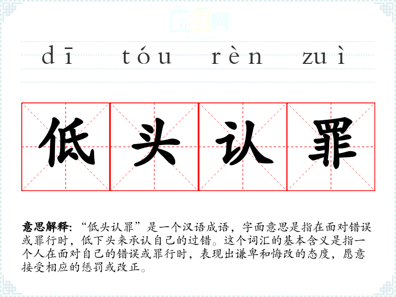 “低头认罪”是一个汉语成语,字面意思是指在面对错误或罪行时,低下头来承认自己的过错。这个词汇的基本含义是指一个人在面对自己的错误或罪行时,表现出谦卑和悔改的态度,愿意接受相应的惩罚或改正。