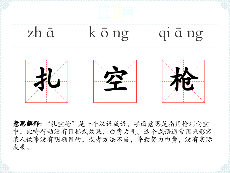 “扎空枪”是一个汉语成语,字面意思是指用枪刺向空中,比喻行动没有目标或效果,白费力气。这个成语通常用来形容某人做事没有明确目的,或者方法不当,导致努力白费,没有实际成果。