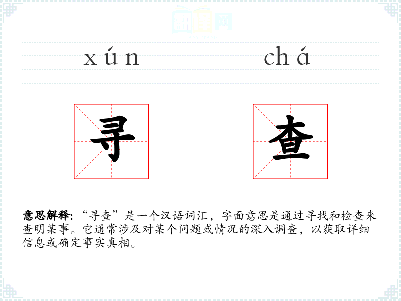 “寻查”由“寻”和“查”两个字组成。“寻”字古已有之,意为寻找;“查”字则有检查、调查之意。两者结合,形成了“寻查”这一复合词,用以表达深入调查的含义。