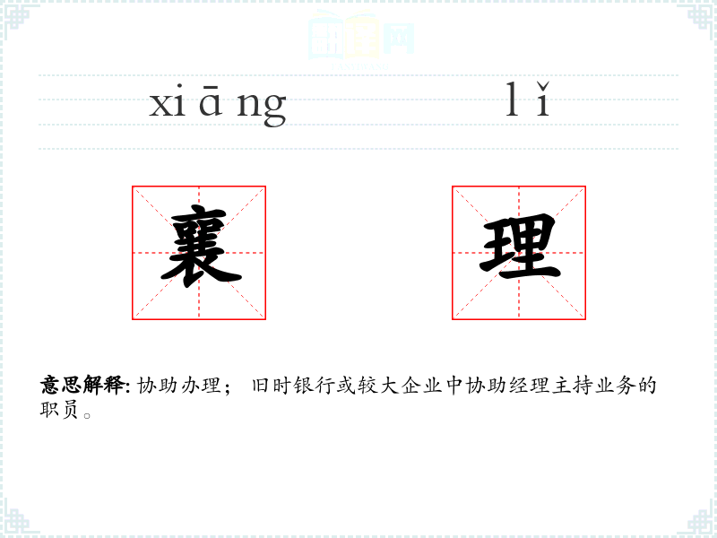 协助办理; 旧时银行或较大企业中协助经理主持业务的职员。