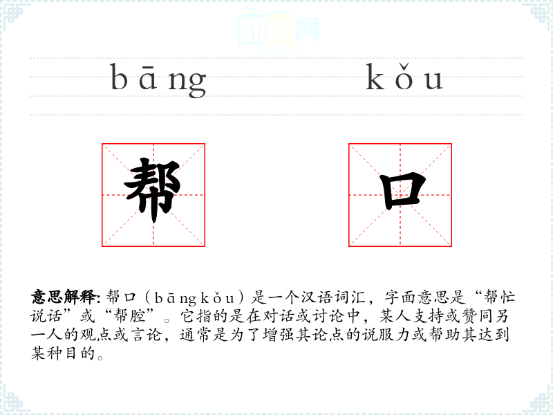 - 口语:在日常对话中,“帮口”通常指的是某人在争论或讨论中支持朋友或同事的观点。