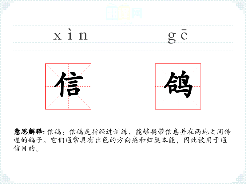 - 反义词:无(信鸽的反义词不明确,因为它是一个特定功能的鸟类)
