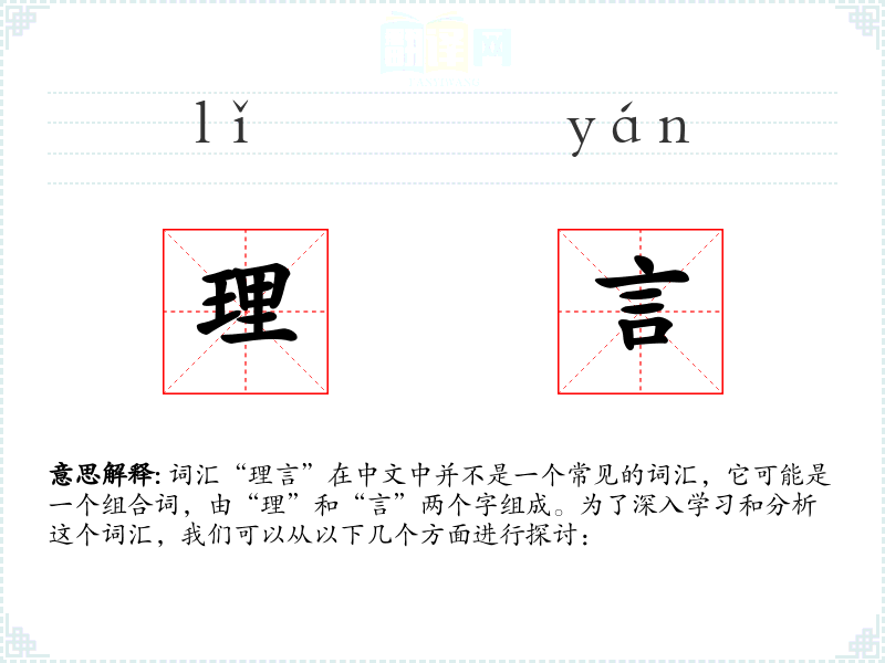- 词源:由于“理言”不是一个常用词汇,其词源可能不太明确,但可以追溯到“理”和“言”这两个字的原始含义。
