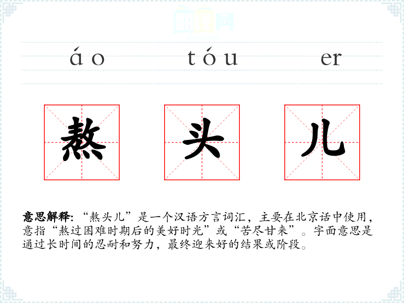 “熬头儿”是一个汉语方言词汇,主要在北京话中使用,意指“熬过困难时期后的美好时光”或“苦尽甘来”。字面意思是通过长时间的忍耐和努力,最终迎来好的结果或阶段。