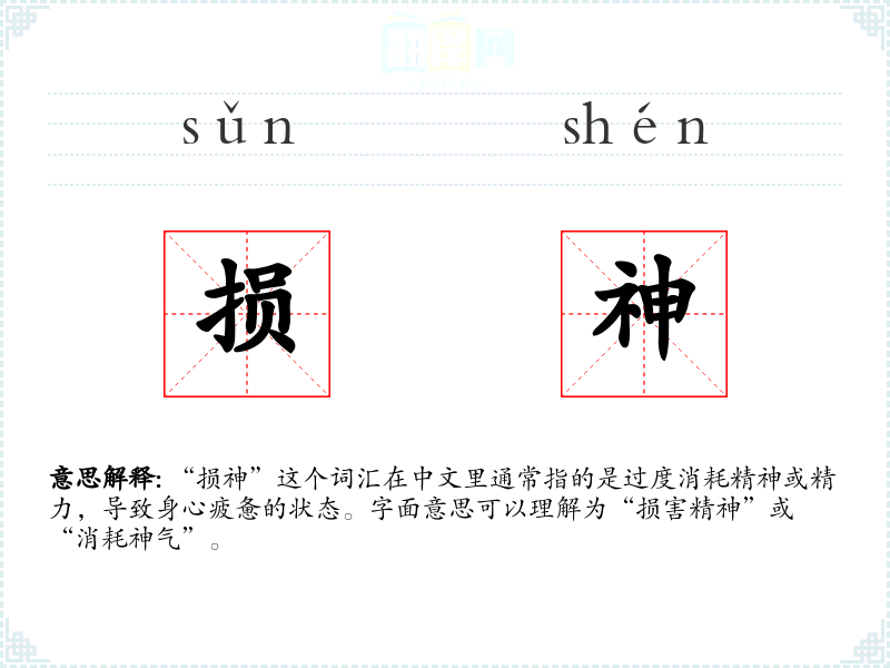 “损神”这个词汇在中文里通常指的是过度消耗精神或精力,导致身心疲惫的状态。字面意思可以理解为“损害精神”或“消耗神气”。