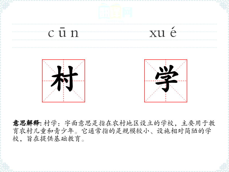 村学:字面意思是指在农村地区设立的学校,主要用于教育农村儿童和青少年。它通常指的是规模较小、设施相对简陋的学校,旨在提供基础教育。