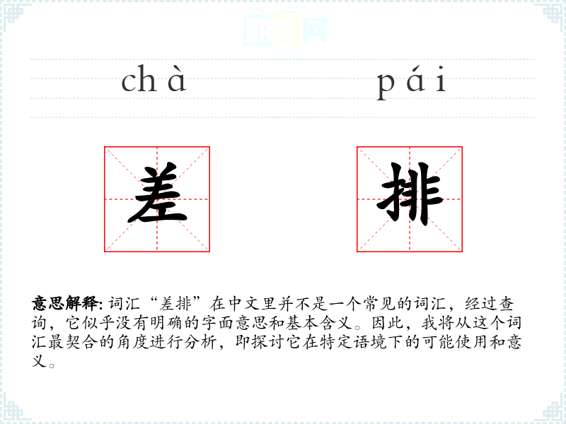 词汇“差排”在中文里并不是一个常见的词汇,经过查询,它似乎没有明确的字面意思和基本含义。因此,我将从这个词汇最契合的角度进行分析,即探讨它在特定语境下的可能使用和意义。