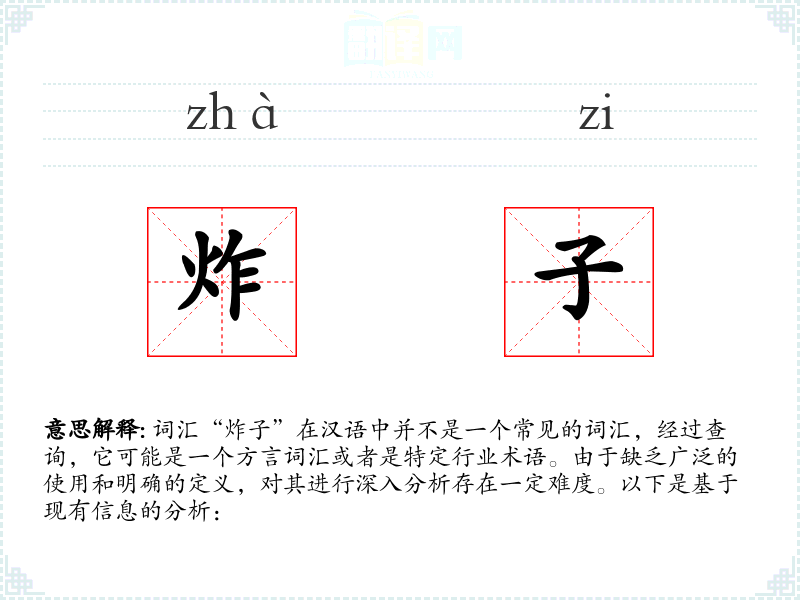 “炸子”这个词汇在普通话中并不常见,可能是某些地区的方言词汇,或者是特定行业的术语。在没有具体上下文的情况下,很难给出确切的字面意思和基本含义。