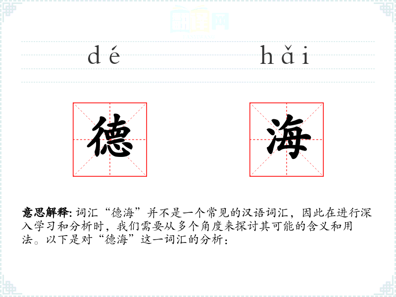 词汇“德海”并不是一个常见的汉语词汇,因此在进行深入学*和分析时,我们需要从多个角度来探讨其可能的含义和用法。以下是对“德海”这一词汇的分析: