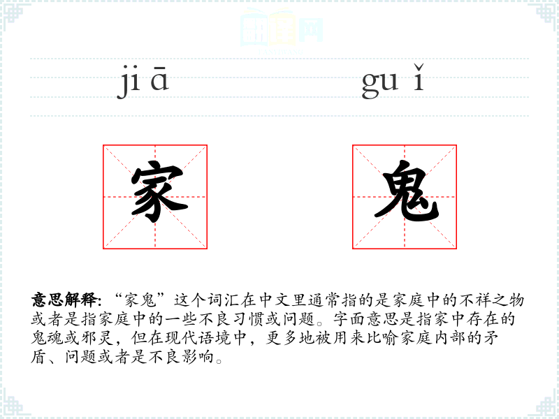 “家鬼”这个词汇在中文中是一个富有象征意义的词汇,它不仅仅指代家庭中的不祥之物,更是家庭问题的隐喻。了解和掌握这个词汇,有助于更好地理解和表达家庭关系中的复杂性和深度。在语言学*和表达中,这个词汇的运用可以增加语言的丰富性和表达的深度。