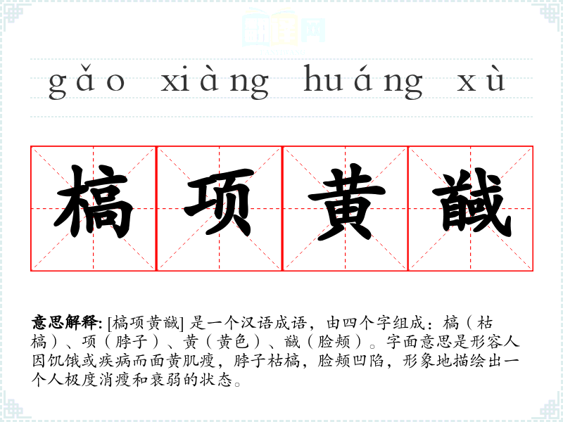 [槁项黄馘] 是一个汉语成语,由四个字组成:槁(枯槁)、项(脖子)、黄(黄色)、馘(脸颊)。字面意思是形容人因饥饿或疾病而面黄肌瘦,脖子枯槁,脸颊凹陷,形象地描绘出一个人极度消瘦和衰弱的状态。
