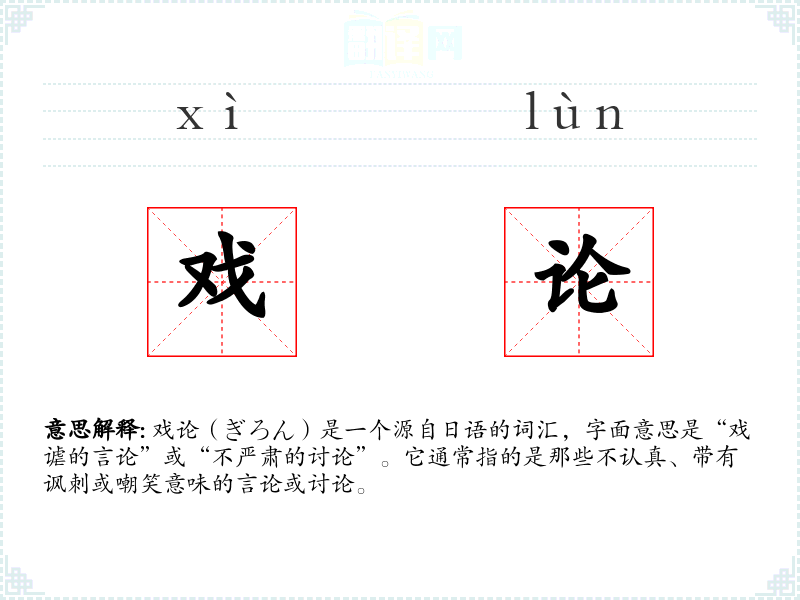 戏论(ぎろん)是一个源自日语的词汇,字面意思是“戏谑的言论”或“不严肃的讨论”。它通常指的是那些不认真、带有讽刺或嘲笑意味的言论或讨论。