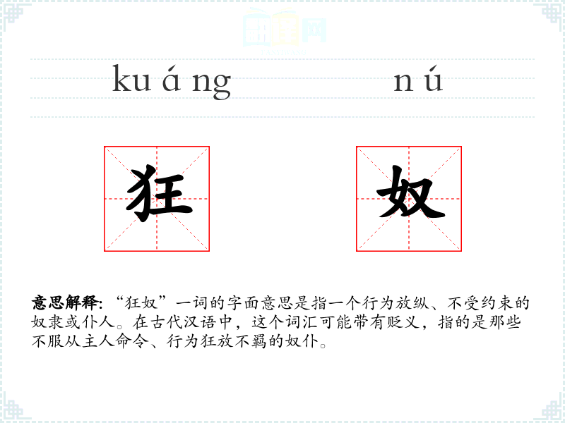 “狂奴”一词的字面意思是指一个行为放纵、不受约束的奴隶或仆人。在古代汉语中,这个词汇可能带有贬义,指的是那些不服从主人命令、行为狂放不羁的奴仆。