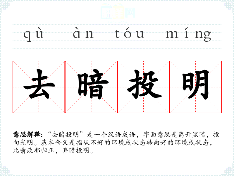 “去暗投明”是一个汉语成语,字面意思是离开黑暗,投向光明。基本含义是指从不好的环境或状态转向好的环境或状态,比喻改邪归正,弃暗投明。