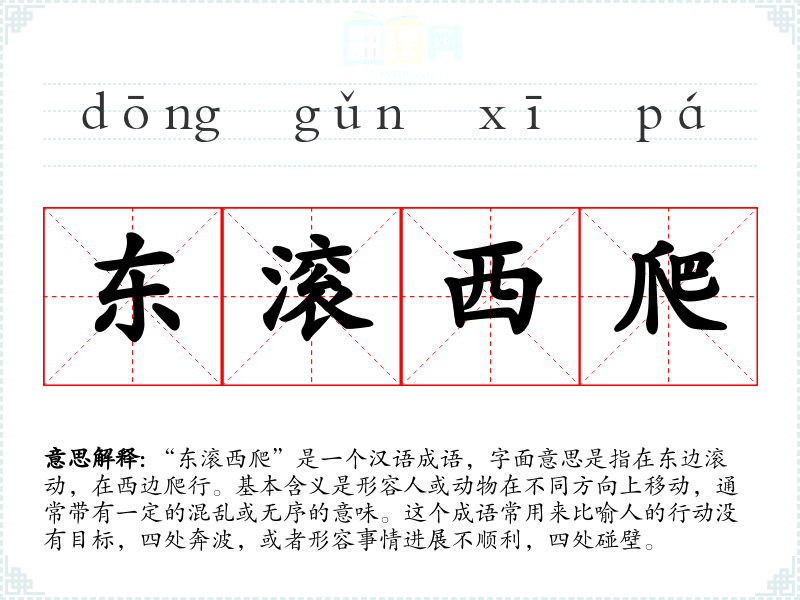 “东滚西爬”是一个汉语成语,字面意思是指在东边滚动,在西边爬行。基本含义是形容人或动物在不同方向上移动,通常带有一定的混乱或无序的意味。这个成语常用来比喻人的行动没有目标,四处奔波,或者形容事情进展不顺利,四处碰壁。