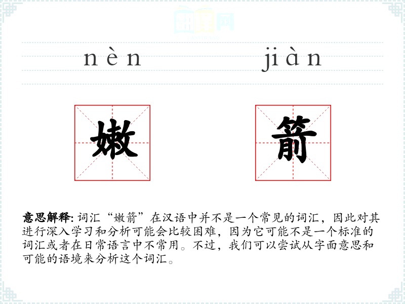 词汇“嫩箭”在汉语中并不是一个常见的词汇,因此对其进行深入学习和分析可能会比较困难,因为它可能不是一个标准的词汇或者在日常语言中不常用。不过,我们可以尝试从字面意思和可能的语境来分析这个词汇。