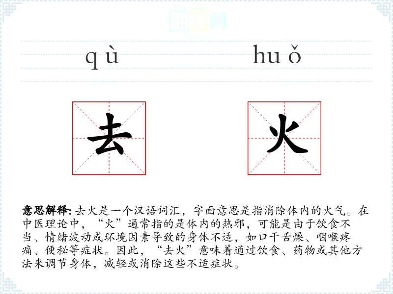 - 反义词:上火、增火(在中医理论中,这些词汇指的是增加体内的热邪)