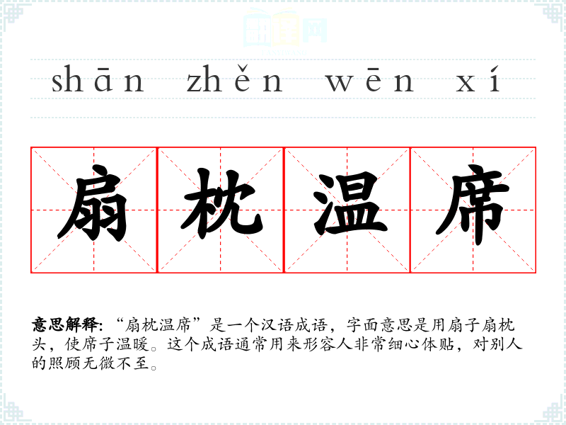 “扇枕温席”是一个汉语成语,字面意思是用扇子扇枕头,使席子温暖。这个成语通常用来形容人非常细心体贴,对别人的照顾无微不至。