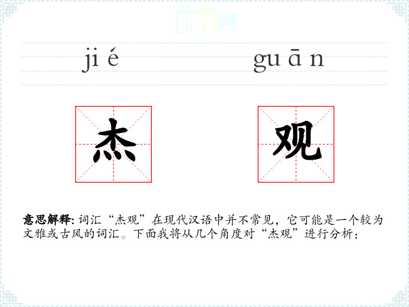 词汇“杰观”在现代汉语中并不常见,它可能是一个较为文雅或古风的词汇。下面我将从几个角度对“杰观”进行分析: