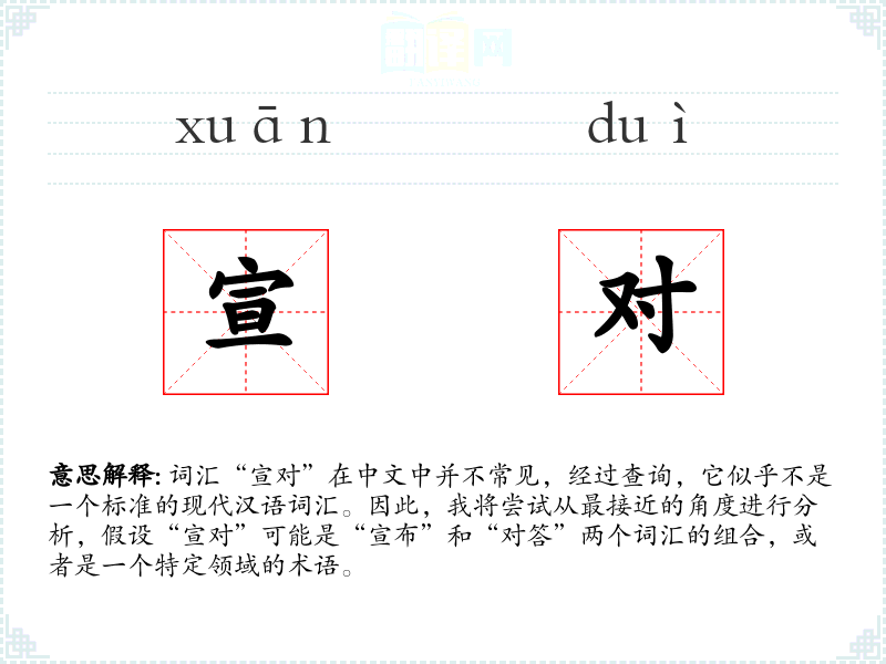 由于“宣对”不是一个标准词汇,对其的理解和应用可能需要依赖特定的语境。在语言学习和表达中,了解词汇的准确含义和用法是非常重要的。如果遇到不熟悉的词汇,应该通过多种途径进行查询和理解。